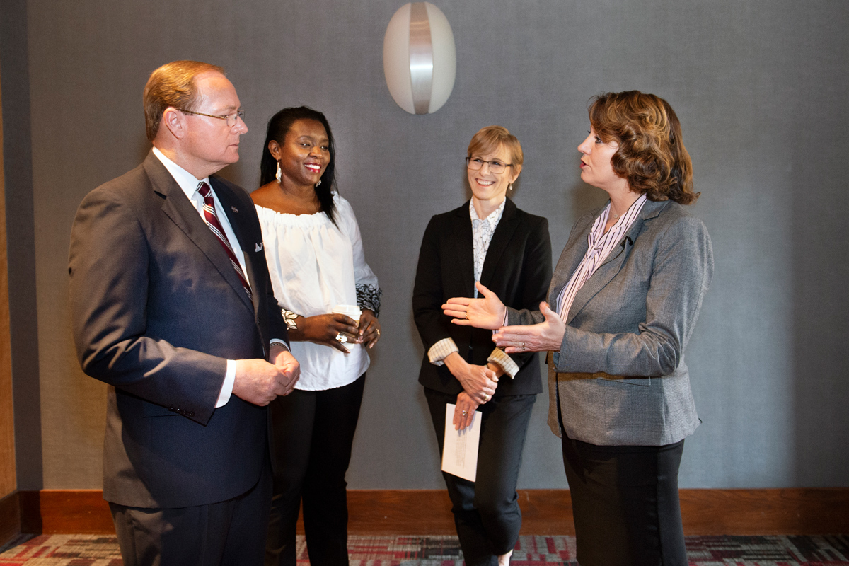 MSU President Mark E. Keenum, far left, speaks with USDA Deputy Under Secretary for Food Safety Mindy M. Brashears, far right, prior to a March 29 campus lecture on the future of women and minorities in agriculture. Looking on are MSU faculty members Caroline Kobia, left, assistant professor in the School of Human Sciences, and Leslie Burger, assistant Extension professor in the College of Forest Resources. Brashears’ lecture was supported by the MSU Office of Research and Economic Development and the university’s Division of Agriculture, Forestry and Veterinary Medicine as part of the USDA National Institute of Food and Agriculture’s Women and Minorities in Science, Technology, Engineering and Mathematics (WAMS) program.