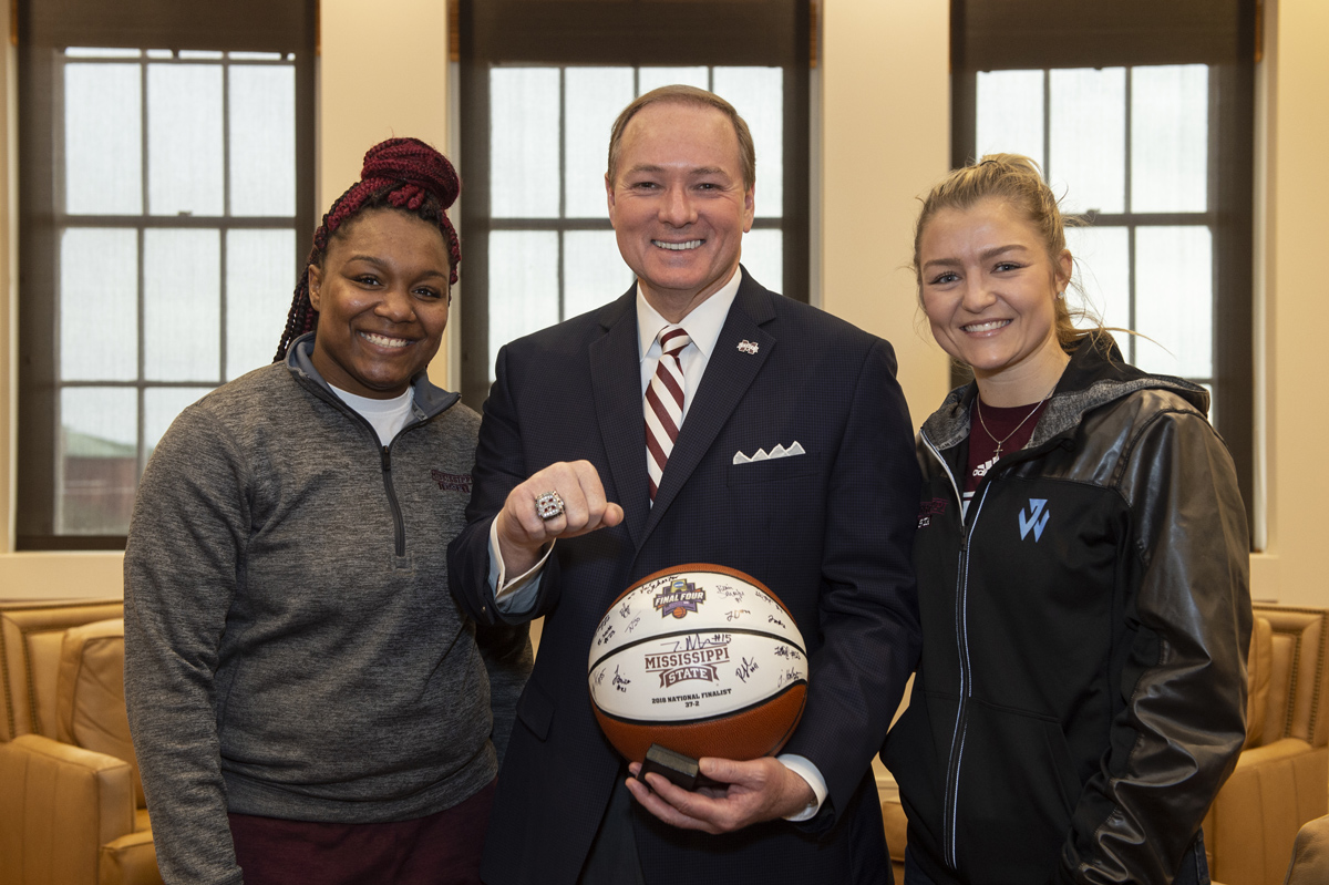 Former MSU women’s basketball stars Roshunda Johnson, left, and Blair Schaefer, right present MSU President Mark E. Keenum with a 2018 National Finalist ring in February to commemorate the Bulldogs’ historic 2017-18 season. Led by four seniors in the starting lineup, including Johnson and Schaefer, MSU completed a perfect 30-0 regular season and claimed the university’s first SEC championship in a women’s team sport. In the NCAA Tournament, the Bulldogs won the Kansas City Regional and advanced to the national championship game for the second consecutive year.
