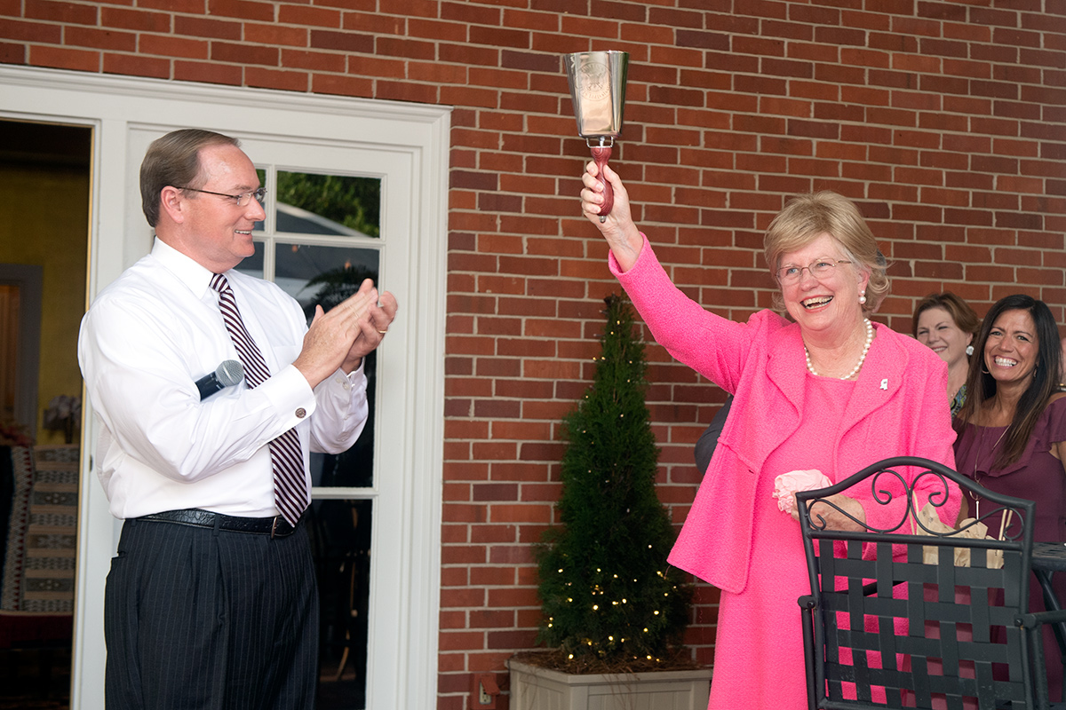 MSU President Mark E. Keenum, left, recently hosted a retirement reception at his home for MSU Provost and Executive Vice President Judy Bonner, who will conclude her service to the university at the end of June. Pictured ringing a chrome cowbell, Bonner is a former president of the University of Alabama who announced in January her intention to retire after a long and distinguished career in higher education.