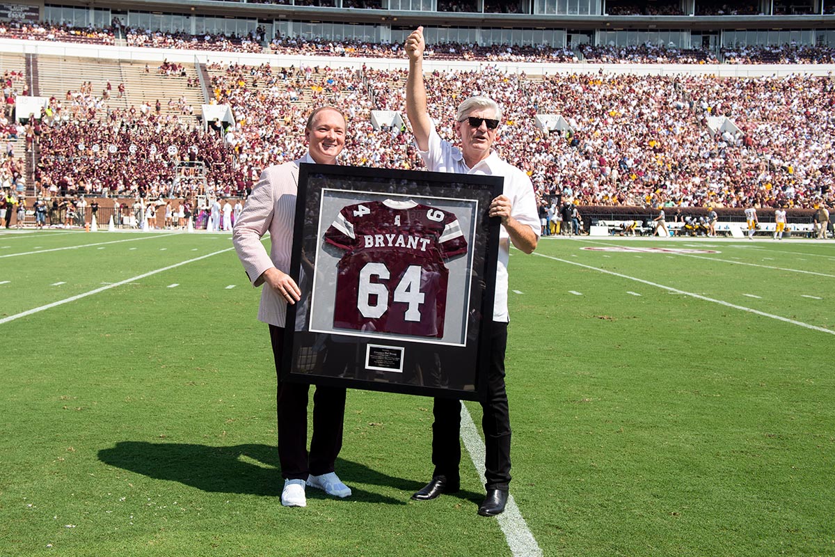 MSU President Mark E. Keenum presents an MSU jersey to Mississippi Gov. Phil Bryant on Sept. 7 during the Bulldogs’ football game against the University of Southern Mississippi. Bryant was recognized for his eight years serving as the Magnolia State’s governor.