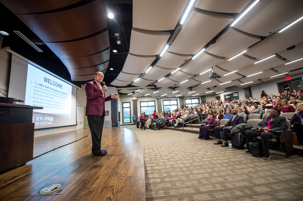 MSU President Mark E. Keenum welcomes participants at today’s [Dec. 17] Staff Development Conference. While students are no longer in classes, MSU employees are continuously working to ensure the state’s leading university stays at the forefront of all areas of operation, especially as these relate to the three-fold mission of learning, research and service. For more photos from today’s conference for support and professional staff, click here.