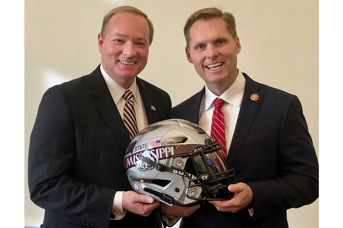 During a February visit to Washington, D.C., MSU President Mark E. Keenum presents U.S. Rep. Michael Guest, R-Miss., a Congressman G.V. “Sonny” Montgomery memorial “Statesman” football helmet from the Bulldog tribute football uniform designed this year to honor Montgomery. Guest, an MSU alumnus, now holds Montgomery’s seat in Mississippi’s Third Congressional District, which includes MSU.