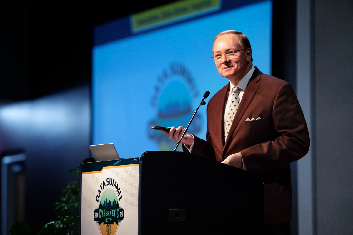 MSU President Mark E. Keenum uses his smartphone to highlight the ways in which technology has rapidly advanced in recent years during a speech Friday [Sept. 13] at the fourth annual NSPARC Data Summit. The event brought together leaders from across the Magnolia State to discuss the ways data and technology can move Mississippi forward.