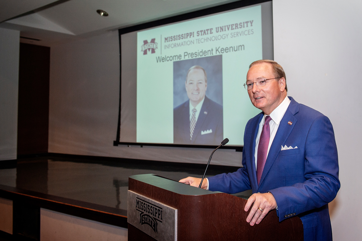 MSU President Mark E. Keenum addressed Information Technology Services employees during the organization’s annual meeting in October, thanking them for their vital contributions to campus, which include maintaining and protecting the university’s wired and wireless networks. ITS has undertaken several recent initiatives to improve IT services on campus and meet changing technological needs.