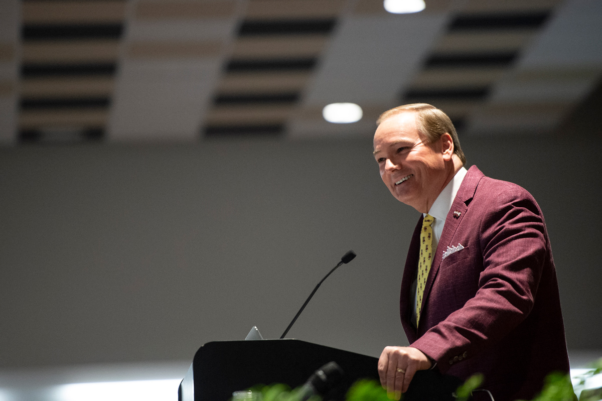 MSU President Mark E. Keenum welcomes the hundreds of professionals attending the university’s 29th annual Insurance Day program, held April 3-4 at The Mill at MSU. Hosted by the MSU College of Business' Risk Management and Insurance Program, the two-day conference brings together industry leaders for sessions that focus on current issues in the field.