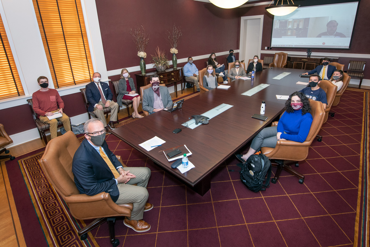 Greg Sankey, bottom left, commissioner of the Southeastern Conference for the past six years, addressed students in November in MSU President Mark E. Keenum’s leadership class. The course introduces high-achieving students to well-known state and regional trailblazers and the qualities that nurture successful leadership.