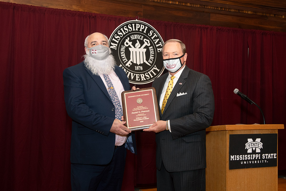 MSU President Mark E. Keenum, right, presents a plaque to newly named W.L. Giles Distinguished Professor Daniel Peterson, director of MSU’s Institute for Genomics, Biocomputing and Biotechnology (IGBB) and a professor in the Department of Plant and Soil Sciences. The honor is one of the highest awards the university can bestow on a faculty member. It is based on distinguished scholarship as evidenced by a record of outstanding research, teaching and service.