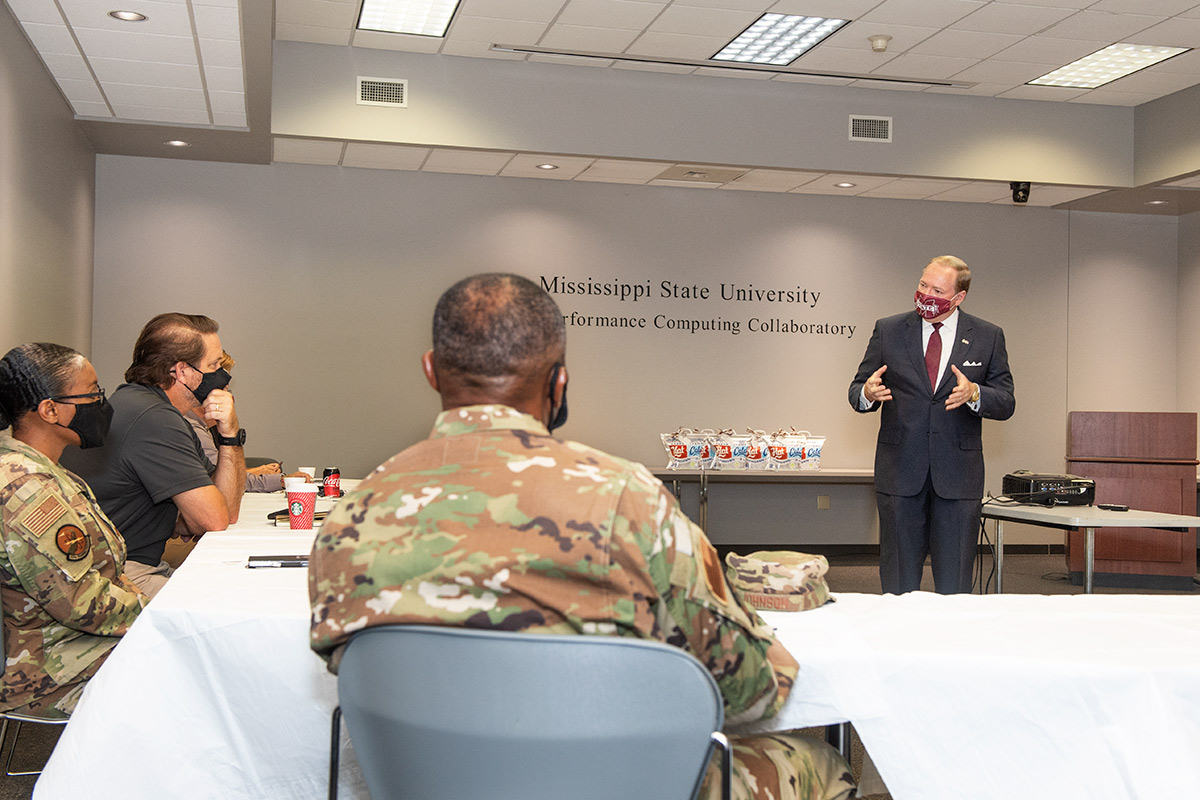Mississippi State University President Mark E. Keenum discusses academic and training partnerships with guests from Keesler Air Force Base. The officials were on campus July 31 to learn more about the university’s focus on cybersecurity, meteorology and the new Bachelor of Applied Science degree program. In addition to their meetings with Keenum, Keesler officials also met with other university experts and toured various MSU research centers.