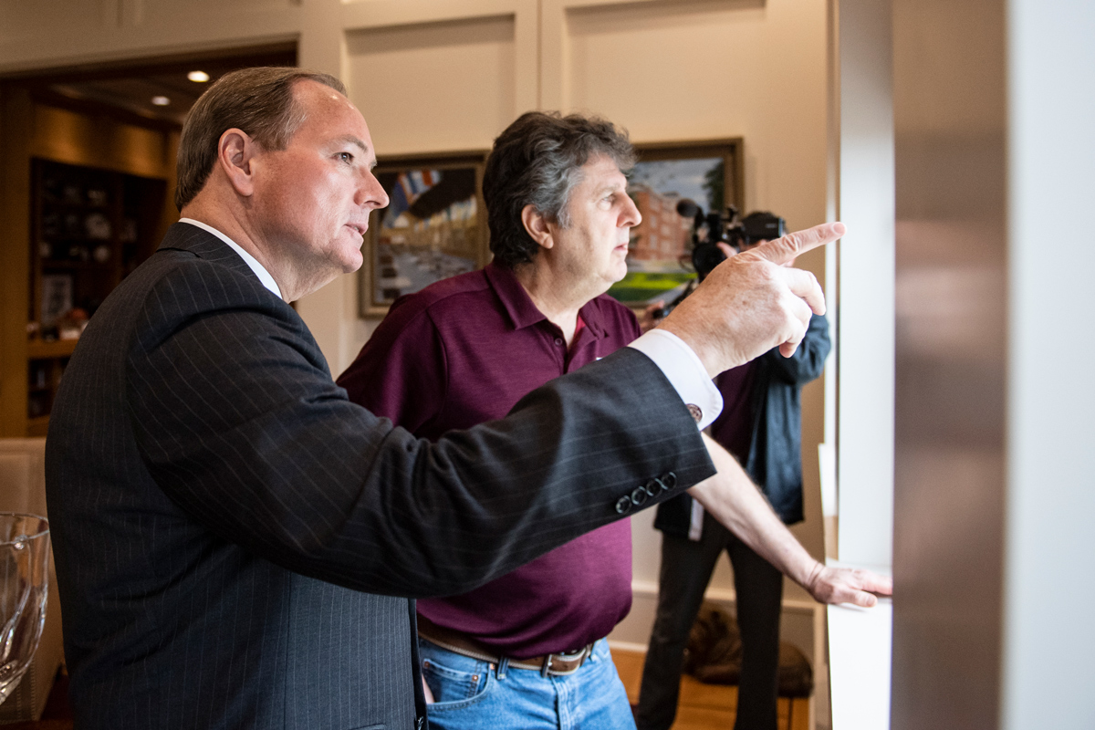 MSU President Mark E. Keenum and new head football coach Mike Leach enjoy the view of the Drill Field from Keenum’s Lee Hall office. Keenum explained some of MSU’s unique attributes to Leach before the two-time national coach of the year held his introductory press conference in January.