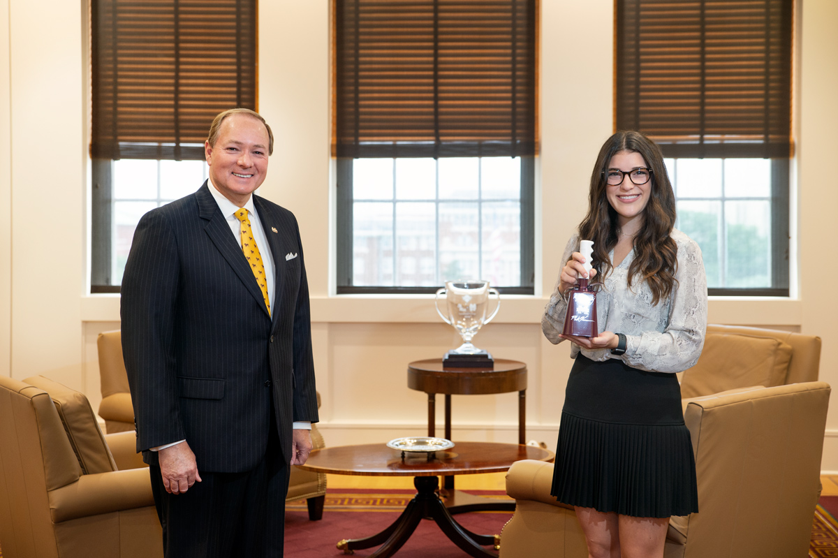 MSU President Mark E. Keenum met this month with Reagan Scott, a Mississippi State graduate student from Pensacola, Florida, who donated her kidney in December to help an LSU student from her hometown. Keenum personally congratulated the 2020 summa cum laude accounting alumna for receiving the Dean of Students’ Award of Excellence. Scott is continuing in MSU’s Master of Professional Accountancy program and is a graduate assistant for the Adkerson School of Accountancy within the College of Business.