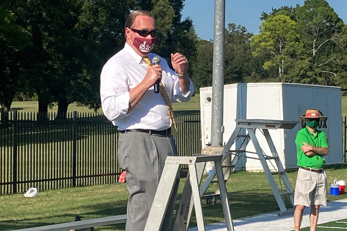 MSU President Mark E. Keenum speaks with members of the Famous Maroon Band during an August practice session. In addition to providing words of encouragement, Keenum delivered MSU ice cream to the band members and staff.