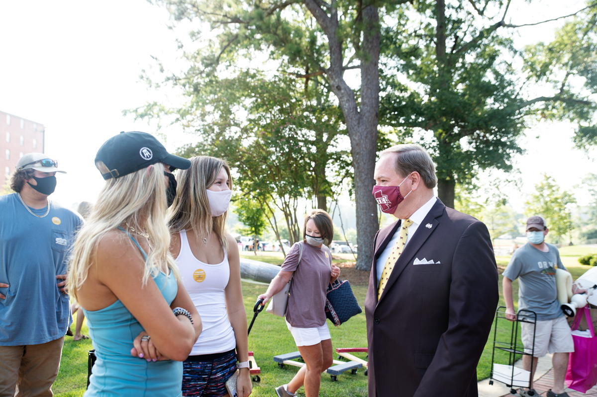 MSU President Mark E. Keenum talks with roommates moving in at Oak Hall in preparation for the fall 2020 semester. Students and their guests, as well as administrators, faculty and staff, are adhering to recommendations from MSU’s special initiative, “Cowbell Well,” which advocates wearing face coverings and other healthy behaviors.