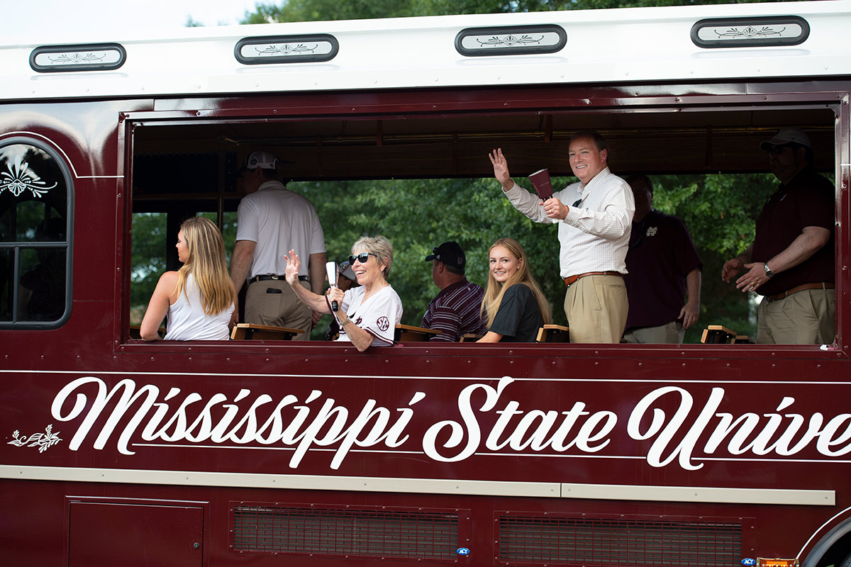 Mississippi State President Mark E. Keenum rides in an MSU trolley down University Drive in Starkville toward the 2021 Baseball National Championship celebration inside Dudy Noble Field at Polk-Dement Stadium on July 2. Starkville Mayor Lynn Spruill and Keenum’s daughter Torie are seated just ahead of him for the parade that included Diamond Dawg student-athletes and coaches, athletics and campus administrators, as well as other invited guests and honorees.