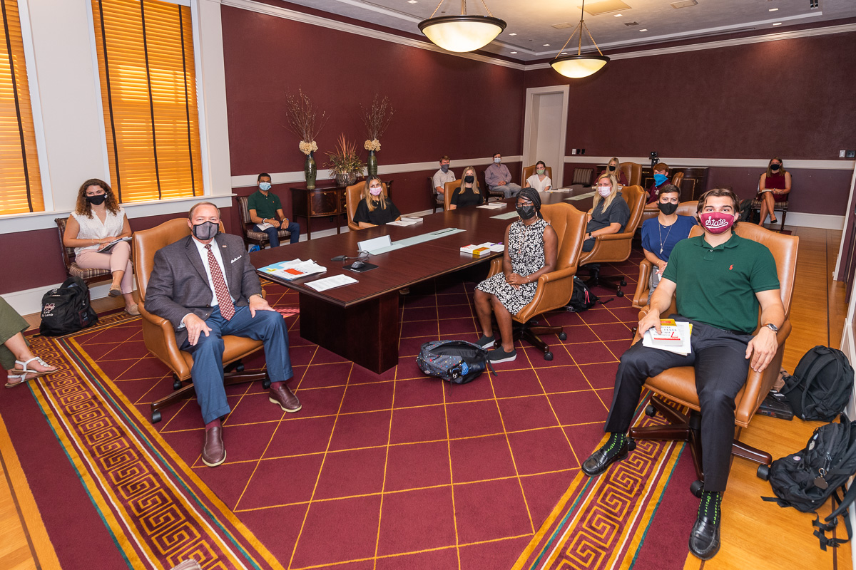 MSU President Mark E. Keenum meets in August with Bulldogs enrolled in his fall leadership class. The course introduces students to leaders across the state who share lessons learned from their respective careers.