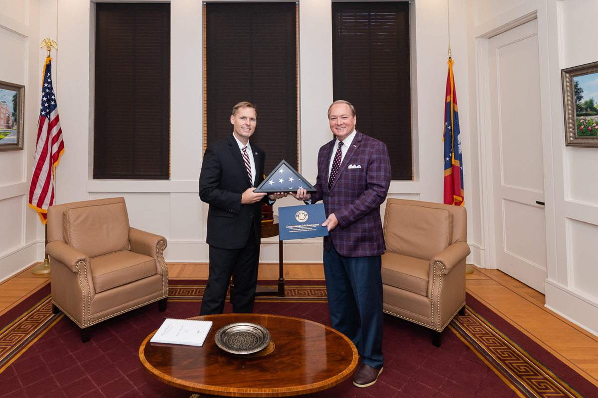 U.S. Representative Michael Guest, left, of Mississippi’s Third District, presented MSU President Mark E. Keenum with an American flag flown over the U.S. Capitol on June 30. The date marks the day MSU’s baseball team won the College World Series at TD Ameritrade Stadium in Omaha, Nebraska.