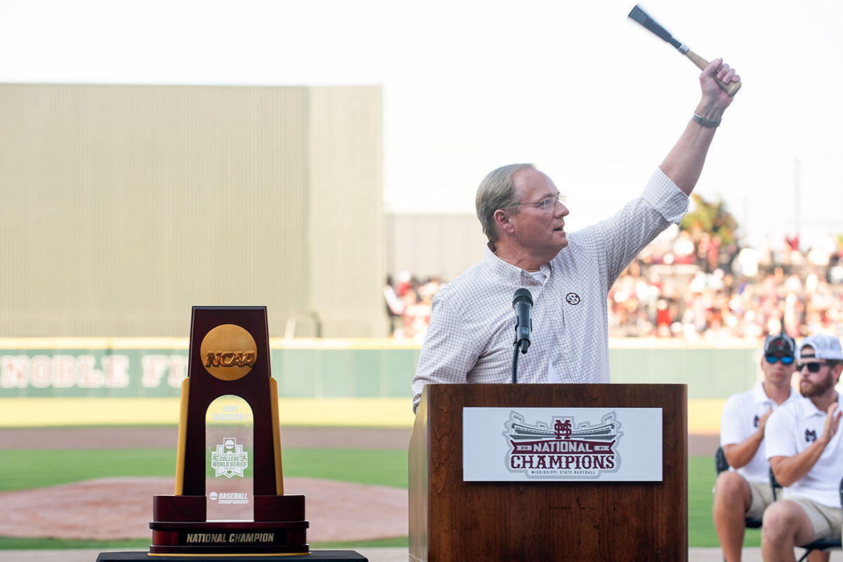MSU President Mark E. Keenum rings a cowbell during the July 2 ceremony at Dudy Noble Field to commemorate the MSU baseball team’s national championship. A near capacity crowd at Dudy Noble gathered to celebrate the 2021 Diamond Dawgs.