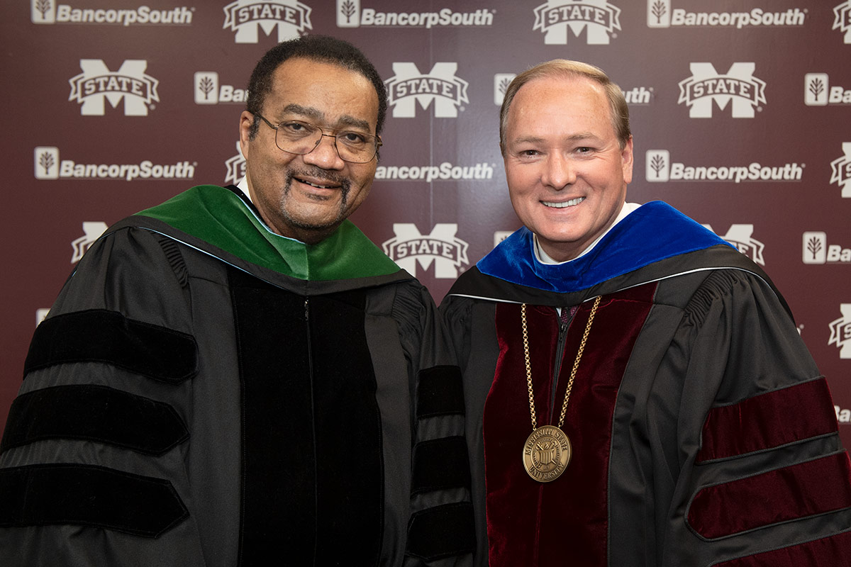 Dr. Alfred E. McNair Jr. of the Mississippi Institutions of Higher Learning Board of Trustees met with MSU President Mark E. Keenum prior to the university's April 29 afternoon commencement ceremony. An IHL Board member since 2015, McNair Jr. is a board-certified gastroenterologist and owner of Digestive Health Center, PA in Ocean Springs.