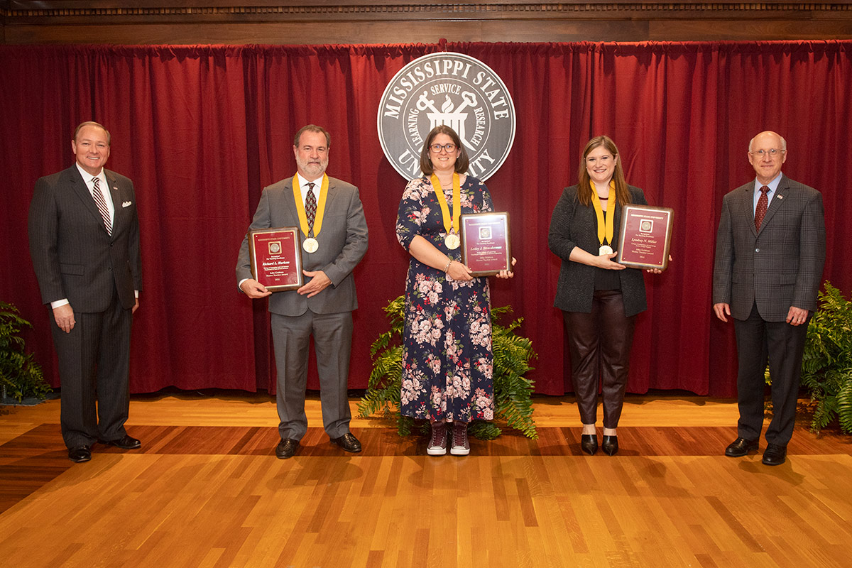 MSU President Mark E. Keenum, left, and MSU Provost and Executive Vice President David Shaw, right, congratulate the university’s 2021 John Grisham Master Teacher Award recipients, Richard Harkess of the Department of Plant and Soil Sciences, Lesley Strawderman of the Department of Industrial and Systems Engineering, and Lyndsey Miller of the Interior Design Program.