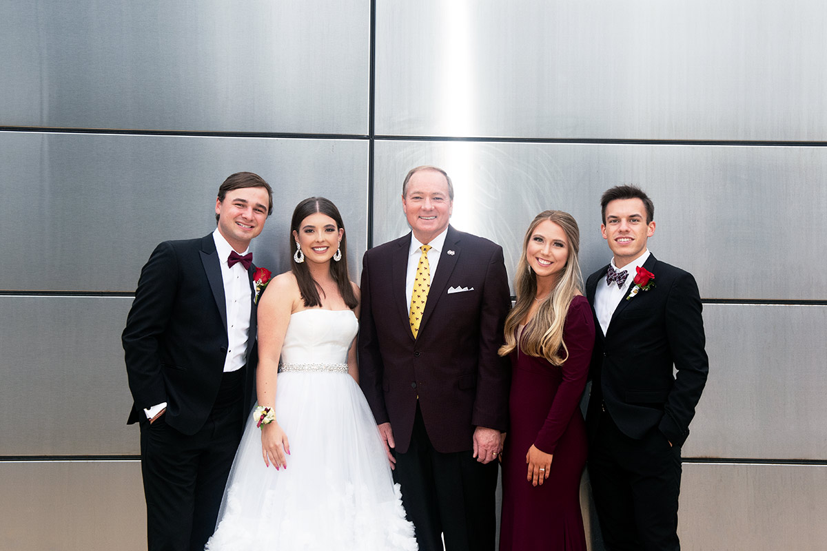 MSU President Mark E. Keenum, center, smiles with four members of the university's 2021 Homecoming Court. They include, from left, Smith Lyon of Greenwood, Homecoming King; Hayden Tucker of Brandon, Homecoming Queen; Kelli Gill Hixson of Batesville, Arkansas, Miss MSU; and Reese Dunne of Starkville, Mr. MSU.