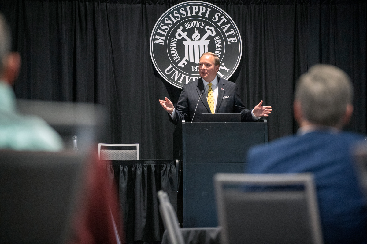 MSU President Mark E. Keenum speaks during the university’s recent Insurance Day, an annual continuing education event organized by the College of Business and its Risk Management and Insurance Program. Having become one of the South’s largest insurance conferences, I-Day annually attracts hundreds of insurance and other professionals to focus on current industry issues.