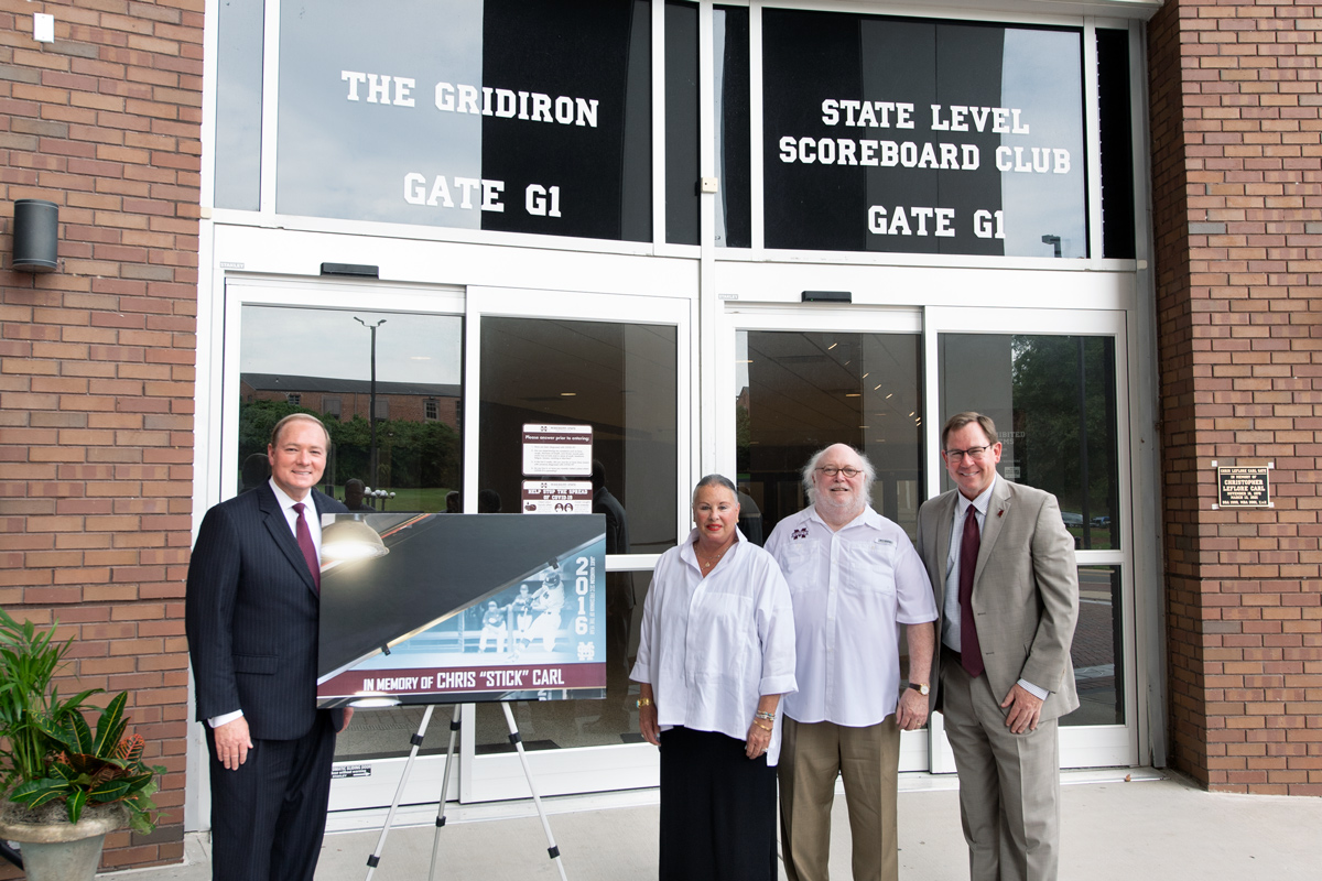 MSU President Mark E. Keenum, left, and Athletics Director John Cohen, right, stand with Margaret and Fred Carl Jr. under the new name of the Davis Wade Stadium gate that now bears the name of the Carls’ late son, Chris. Chris held a bachelor’s and master’s degree in business administration from MSU, was a member of Sigma Alpha Epsilon, and was a true Bulldog fan. The naming ceremony was held in mid-October.
