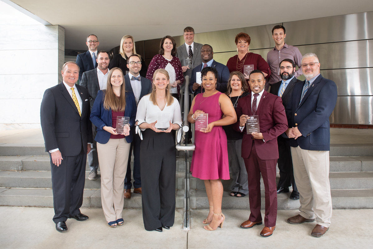 MSU President Mark E. Keenum (front row, far left) and MSU Leadership Development Program Coordinator Brad Skelton (front row, far right) congratulate this year’s 15 LDP graduates. They include (front row, second from left) Meredith Nagel, Libby Durst, Ariel Burks, Timothy Hopkins; (middle row, l-r) Corey Hancock, George Dunn, Anna Sparks, Doug Bedsaul; (top row, l-r) Stephen Williams, Katie Sisk, Robin Graves, Doug Gernaat, Jermaine Jackson, Nancy Wilson and Austin Dillard.