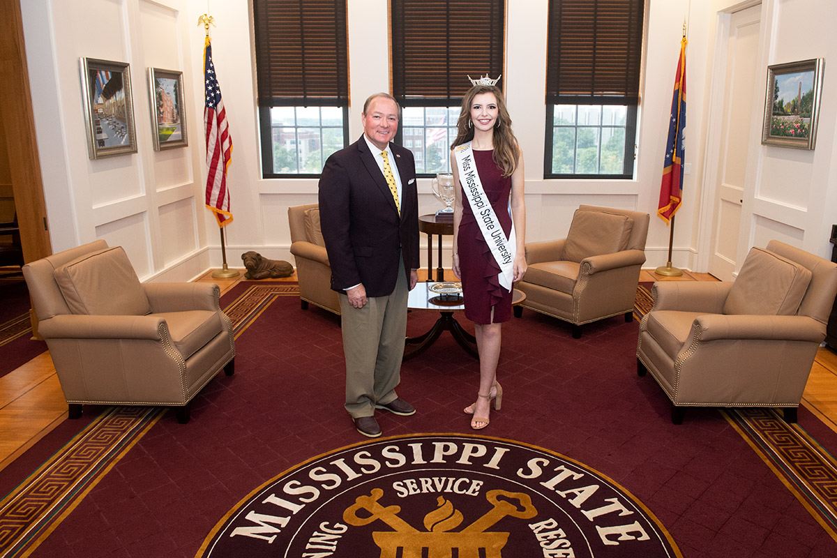 MSU President Mark E. Keenum is pictured with reigning Miss MSU Leah Boyd of Madison, Alabama. The music education major with concentrations in vocal and piano graduated summa cum laude in 2020.