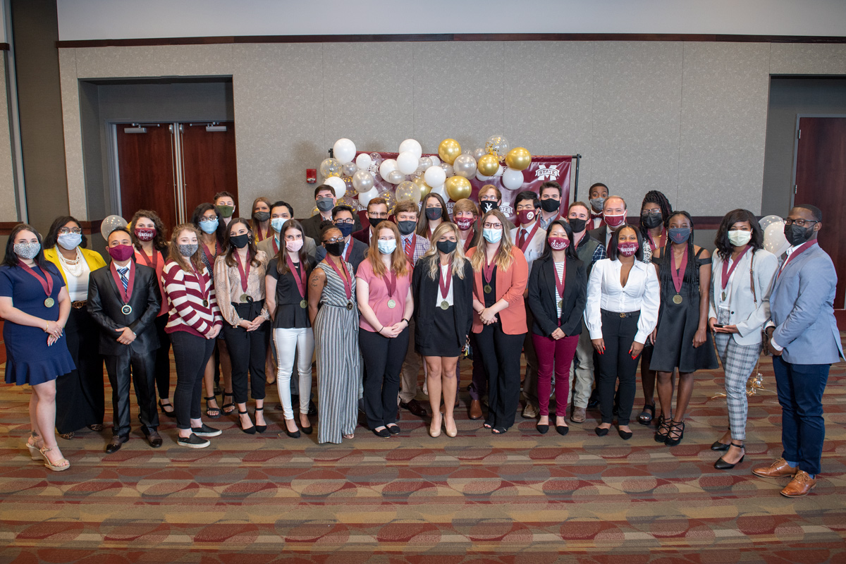 MSU President Mark E. Keenum (back right) is pictured among the 2021 class of the university's Montgomery Leadership Program Fellows. Participants of this three-semester program gain leadership and service skills for successful careers in their respective fields.