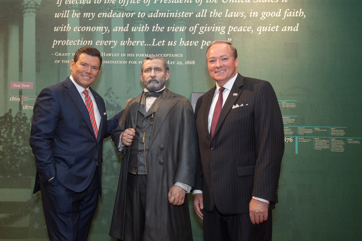 Bret Baier, author of the forthcoming book “To Rescue the Republic: Ulysses S. Grant, the Fragile Union, and the Crisis of 1876,” and MSU President Mark E. Keenum are pictured with one of the life-size statues of Ulysses S. Grant in the Grant Presidential Library, which is housed at Mississippi State’s Mitchell Memorial Library.