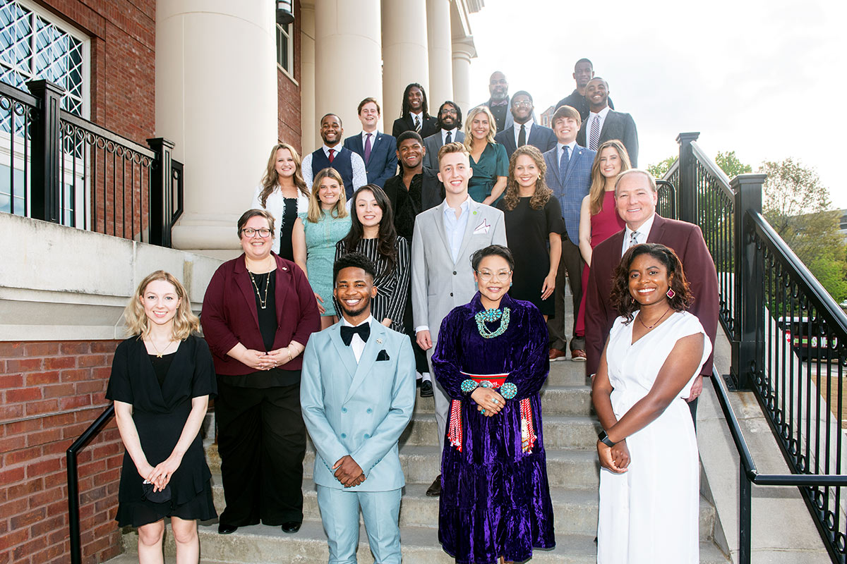 MSU Vice President for Student Affairs Regina Hyatt (second row from bottom, left) and MSU President Mark E. Keenum (second row from bottom, right) congratulate the university’s 16th annual Spirit of State Award recipients. Pictured with Hyatt and Keenum on the steps of Old Main Academic Center are (bottom row, l-r) Madison Taylor of Fulton; Alex Jackson of Greenville; April Yazza of Albuquerque, New Mexico; Makayla Brister of Raymond; (Hyatt); (Keenum); (third row, l-r) Sofia Alvarez of Belmont; Philippe Schicker of Hamburg, Germany; (fourth row, l-r) Malon Stratton of Ridgeland; Katey Koon of Franklin, Tennessee; Metri Lyons of Bay Saint Louis; Julianna Mills of Brookhaven; Sarah Helen Skelton of Jackson; (fifth row, l-r) Dell Ivy of Macon; Claire Hamblen of Franklin, Tennessee; Ethan Utterback of Ocean Springs; (sixth row, l-r) Jay Warren of Gulfport; Anirudh Aditya of Birmingham, Alabama; Elliott Ware of Jackson; Tyler Packer of State Line; (top row, l-r) Sydney Wicks of Clinton; Karsten Taylor of Meridian; and Asishana Ajayi of Edo State, Nigeria. Not pictured is Nirmal Bhatt of Collierville, Tennessee.