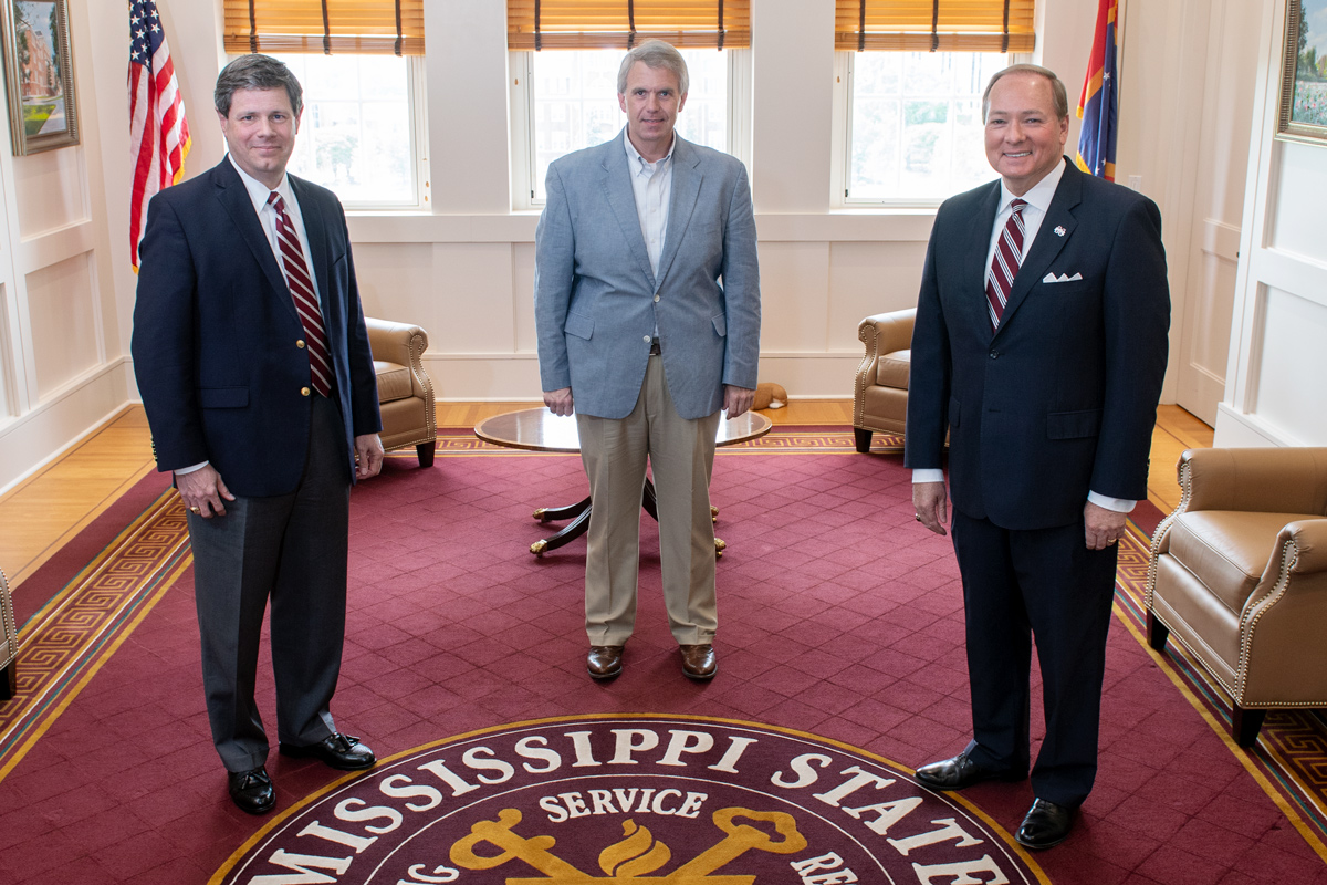 MSU President Mark E. Keenum, right, hosted Mississippi Power Chairman, President and CEO Anthony Wilson, left, and Northern District Public Service Commissioner Brandon Presley in April. Wilson, an MSU alumnus, also currently serves as vice-chair of the MSU Foundation Board of Directors.