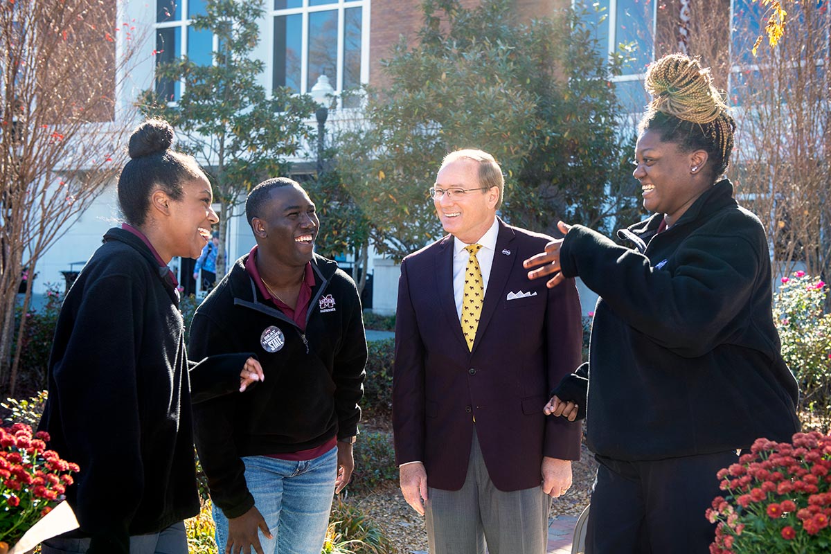 President Mark E. Keenum gathered with students on a picture-perfect Maroon Friday to sign cowbells and other items and take photographs during “More Cowbell”—an event organized by MSU’s Student Association to wrap up the end of True Maroon Week 2021. He was joined in front of Colvard Student Union by Roadrunners (from left) Lauryn Carr, Nehemiah Hicks and Chrissy Hoofby. The university’s 21st live Bully, Jak, also was on hand for the Friday festivities.