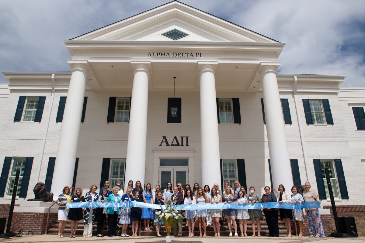 MSU President Mark E. Keenum helps cut the ribbon on the new Alpha Delta Pi sorority house at MSU during an April ceremony. First Lady Rhonda Keenum, an alumna of MSU’s Alpha Delta Pi chapter, was among the many current and former members of the sorority that gathered to mark the occasion.