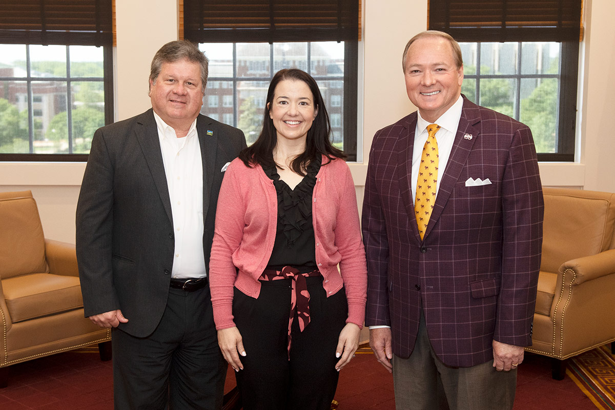MSU President Mark E. Keenum, right, welcomes Mike Armour, state of Mississippi director for the Appalachian Regional Commission, and Andrea Rose, ARC project manager, to campus during an April visit. Armour and Rose received tours of the MSU campus and discussed ways to further develop partnerships between ARC and MSU.