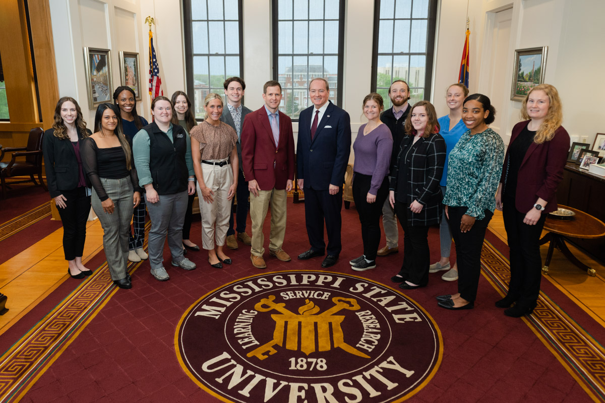 The MSU College of Veterinary Medicine Class of 2024 Bardsley Scholars are pictured with CVM Associate Dean for Academic Affairs Jack Smith and MSU President Mark E. Keenum. Each year, eight to 12 entering DVM students are selected as recipients of the Bardsley Scholarship based on grade point average, extracurricular activities and leadership potential. The scholars must maintain a 3.5 GPA in their studies at CVM and are given preferential scheduling and leadership development opportunities. The scholarships are made possible by a gift from the estate of Dr. Charles and Viola Bardsley, who lived on the Mississippi Gulf Coast and took a special interest in the College of Veterinary Medicine.