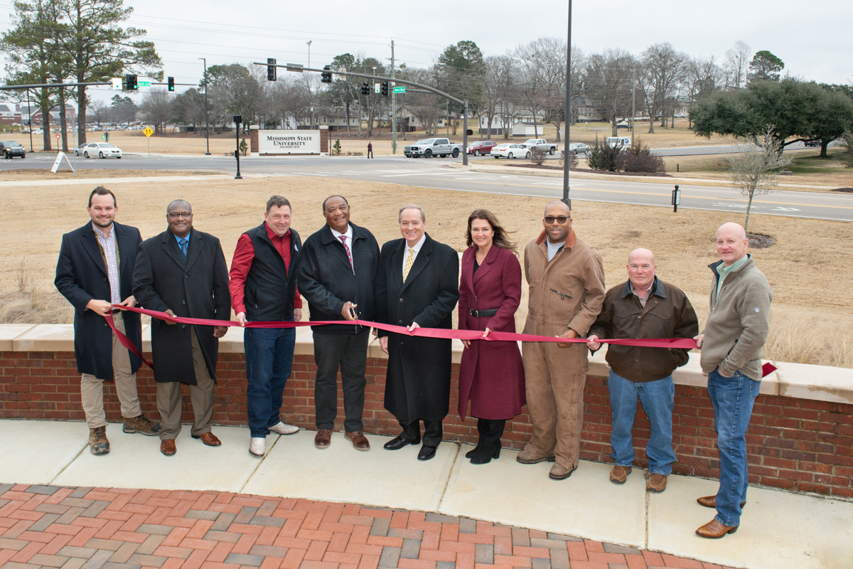 MSU and Oktibbeha County officials cut the ribbon on the Blackjack Road project adjacent to the Starkville campus. Shown, left to right, are Nic Parish of Burns Construction, Oktibbeha County Supervisor Marvell Howard, Northern District Transportation Commissioner John Caldwell, Supervisor Joe Williams, MSU President Mark Keenum, Board of Supervisors President Bricklee Miller, Supervisor Orlando Trainer, County Engineer Clyde Pritchard, and MDOT State Aid Road Engineer Jerry Gilliland.