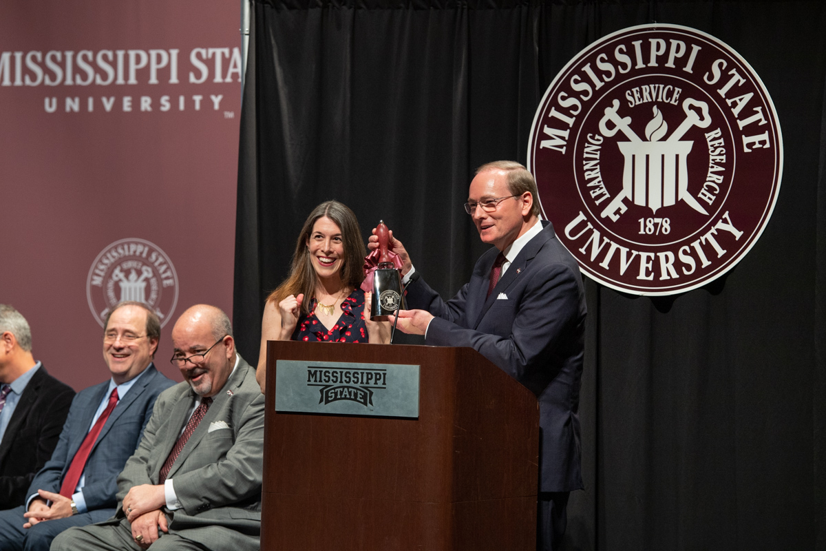 Mississippi State University President Mark E. Keenum presents English Professor Catherine Pierce with a ceremonial chrome cowbell during a public presentation Monday [April 11] honoring her role as Mississippi’s current Poet Laureate. She said her goal is to make poetry accessible to all Mississippians.