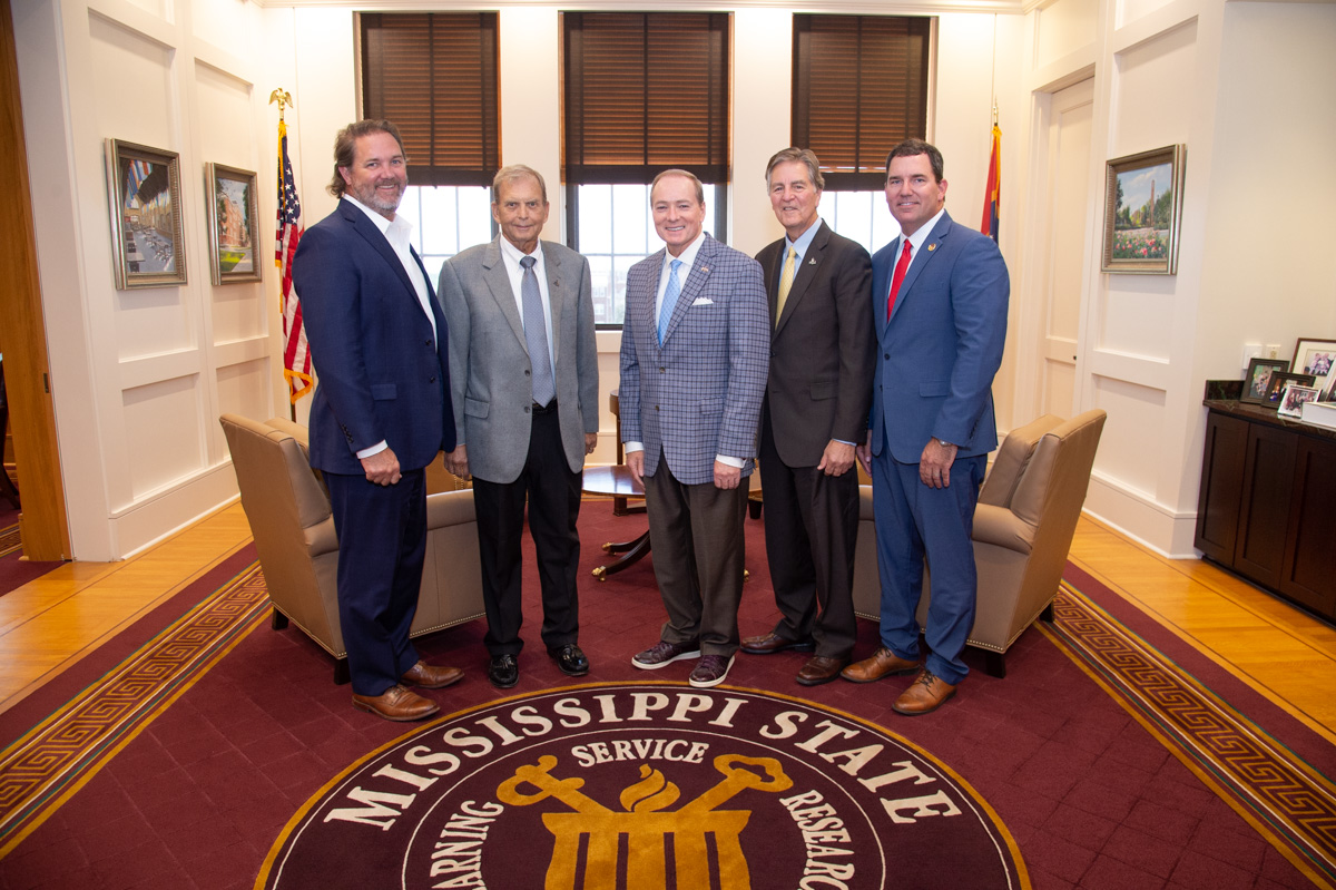 State and civic leaders from the Gulf Coast visited the Starkville campus in June to learn more about MSU’s academic, research and outreach missions, including the Mississippi Cyber Initiative and its proposed home, the Mississippi Cyber and Technology Center, to be constructed adjacent to Keesler Air Force Base in Biloxi. MSU President Mark E. Keenum, center, welcomed guests, from left, State Senator Scott Delano, USAF Lt. Gen. Mike Peterson, Biloxi Mayor Andrew “FoFo” Gilich, and State Representative Kevin Felsher.