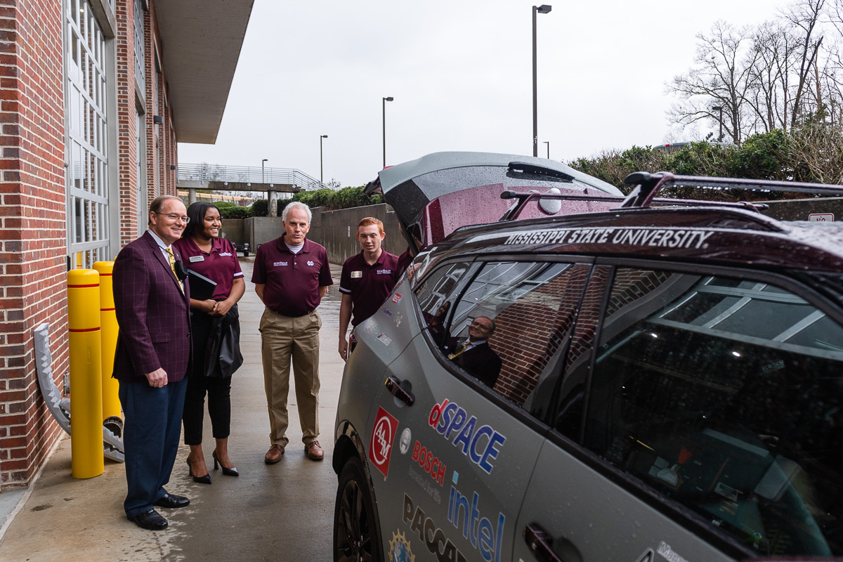 MSU’s EcoCar Mobility Challenge Team provided Mark E. Keenum, university president, with an update on their progress as they enter the fourth year of this national competition sponsored by the U.S. Department of Energy. Giving Keenum, at left, the car’s progress report were graduate student Rachel Hendricks, Hoover, Alabama; associate professor Randy Follett, electrical and computer engineering; and sophomore Nathan Reynolds, Petal. As the premier collegiate automotive engineering contest, the challenge involves 11 U.S. universities applying advanced propulsion systems and SAE Level 2 autonomy, combined with V2X connectivity, to improve a 2019 Chevrolet Blazer’s energy consumption.