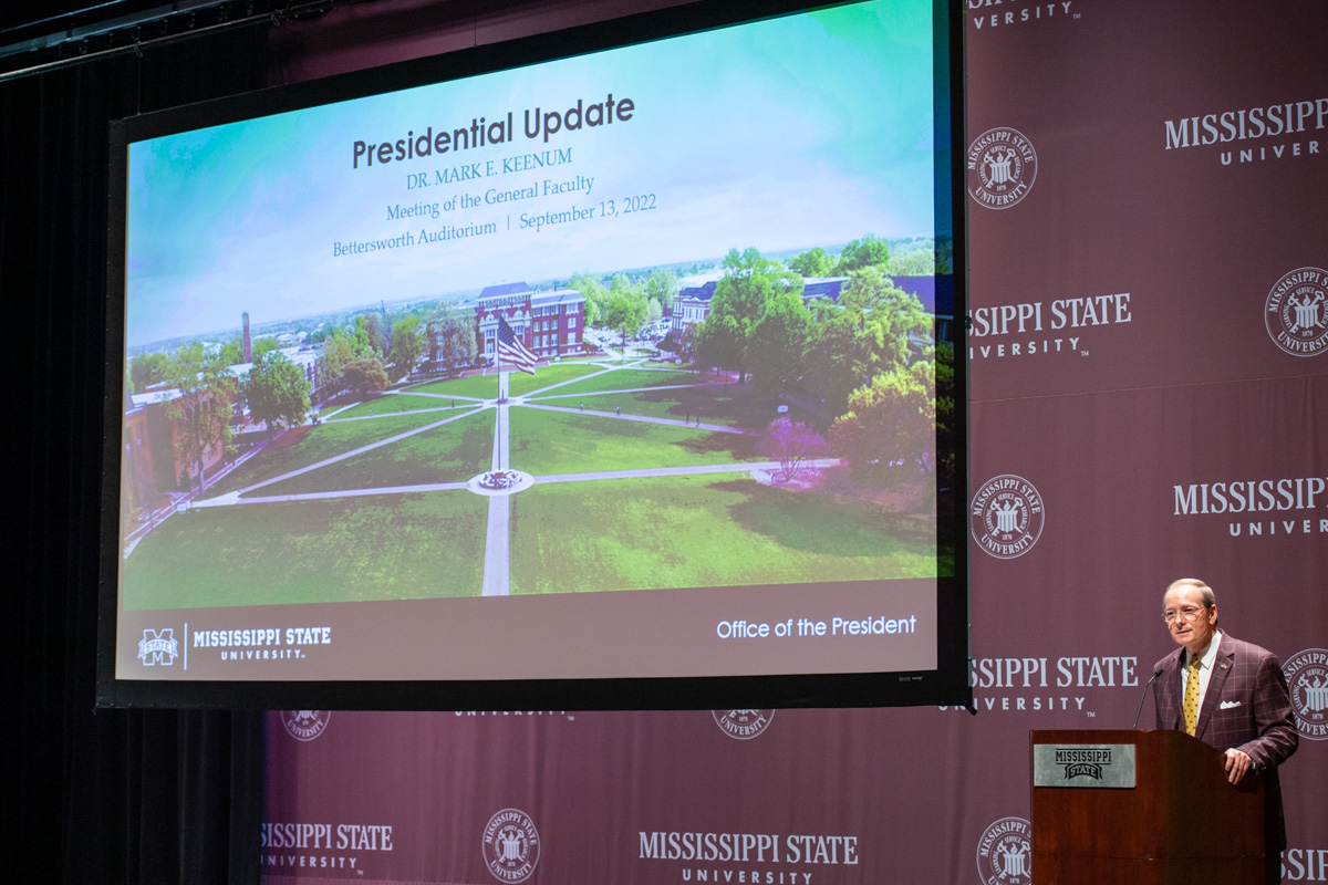 MSU President Mark E. Keenum speaks to faculty and staff Tuesday [Sept. 13] during the annual Fall General Faculty Meeting.
