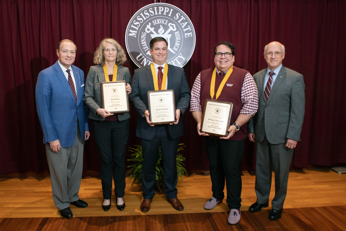 MSU President Mark E. Keenum, left, and MSU Provost and Executive Vice President David Shaw, right, are pictured with the university’s 2022 John Grisham Master Teacher Award recipients Deb Mlsna, Jacob Tschume and Mike Breazeale. First presented in 1993, the Grisham Master Teacher honor is a tribute to classroom and instruction excellence and is named for the MSU accounting alumnus and internationally recognized best-selling author who provided funds to endow the award.