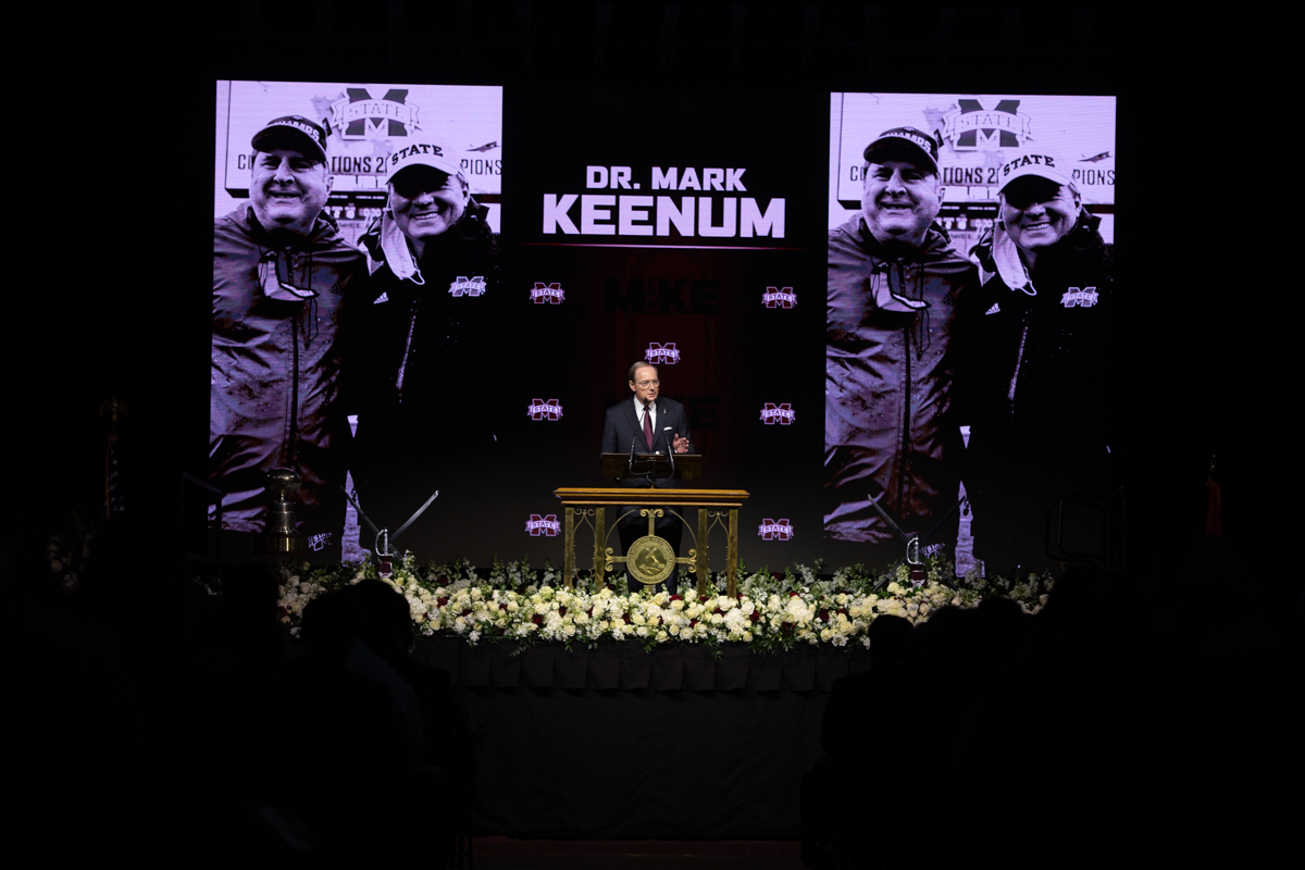 MSU President Mark E. Keenum pays tribute to MSU’s Head Football Coach Mike Leach at a well-attended memorial service at Humphrey Coliseum following the sudden death of one of the sport’s greatest offensive innovators. The service included stories about Leach, who will be remembered for his larger-than-life personality, humor and love of conversation as much as for his coaching legacy and signature “Air Raid” offense.