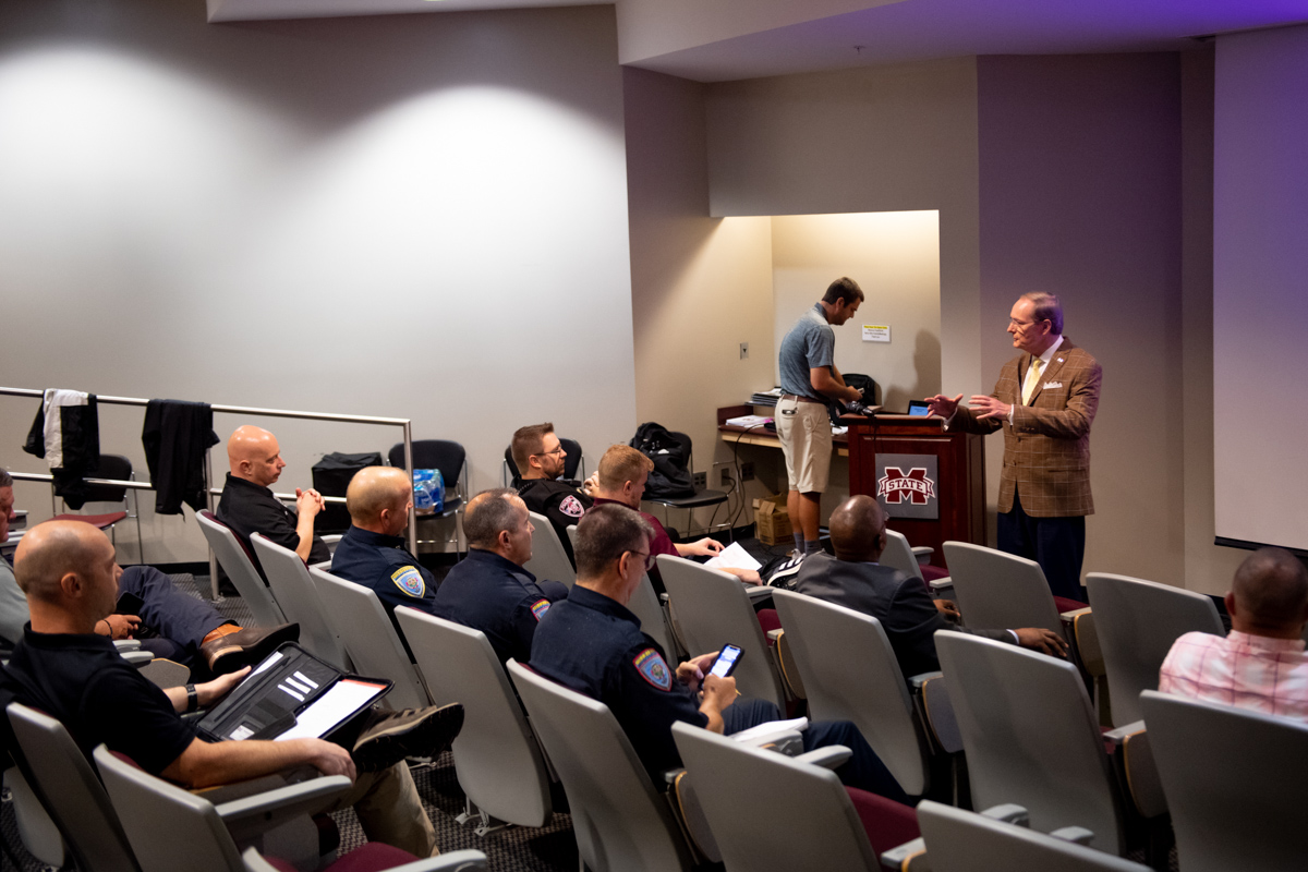 MSU President Mark E. Keenum thanks area law enforcement officers from Starkville and the university for their dedication to keeping the community safe on gamedays and throughout the year during a campus recognition program.