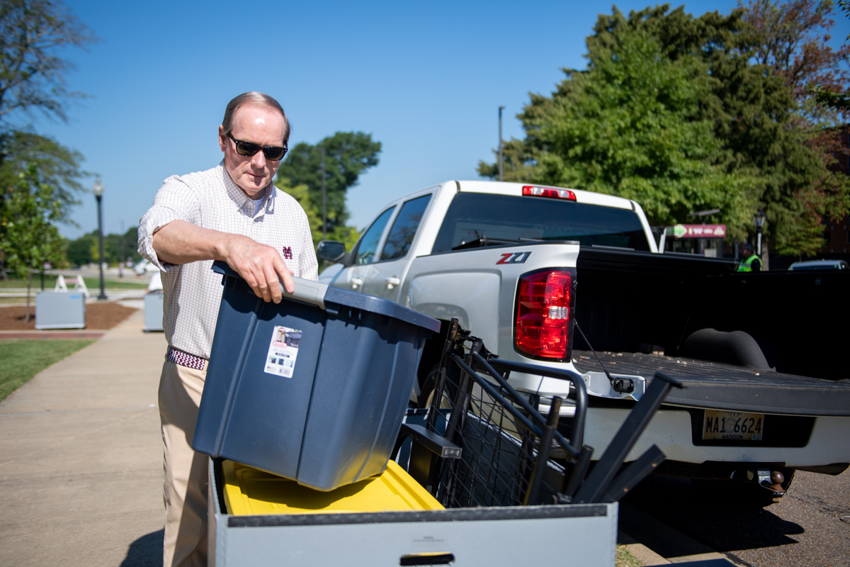 With August being move-in month at Mississippi State, MSU President Mark E. Keenum joins in the excitement of new students making their home in one of many university residence halls. The yearly event called MVNU2MSU is a highly anticipated time in the lives of first-time freshmen as MSU volunteers, including Keenum, roll up their sleeves to assist.