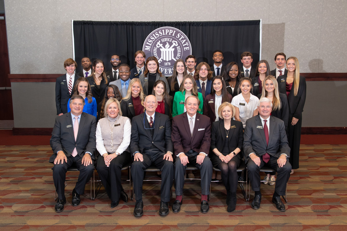 Mississippi State’s 24 Luckyday scholarship recipients were honored this month with a pinning ceremony, where the Luckyday Foundation Board of Managers and university administration congratulated them for joining a community of student leaders learning to take real action in improving the world. First row, l to r, are Luckyday board members Jerry Host, Foundation manager; Kristin R. Merrell, Foundation manager; Jamie Houston, chairman; MSU President Mark E. Keenum; Patricia G. Smith, Foundation executive director; and Granville Tate, Foundation manager. Second row, Luckyday scholars Hallie Young, Brandon; Makedra McCoy, Pearl; Hali Hollman and Madilyn Hemphill, both of Brandon; Emily Rivers, Ellisville; Sophia Singley, Columbus; Rosemary Chow, Greenville; and Molly Tannehill, Oxford. Third row, Christopher Shaffer, Myrtle; Avery Jones, Collinsville; Nathan Cooke, Byram; Josie Baird, Myrtle; Alice Ann Haab, Louisville; Sean Artigues, McComb; Ashantis Wigley, Belzoni; Avery James, Madison; Josephine Smith, Ridgeland. Fourth row, Jeremy Tyler, Hollandale; Jakobi Walton, Madison; Luke Wiest, Hattiesburg; Christopher Hussey, Tupelo; Aaron Lampley, Noxapater; Kristofer Cook, Vicksburg; and August Jones, Bay Springs.
