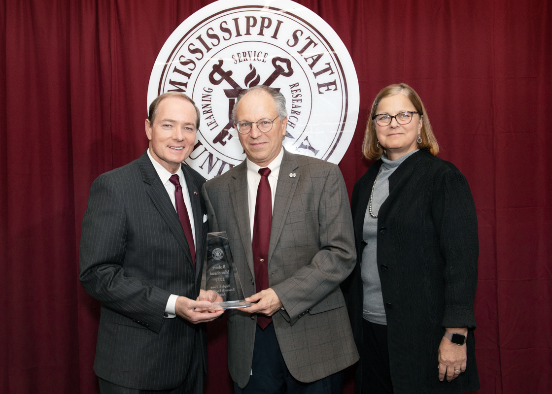 MSU President Mark E. Keenum and Vice President for Research and Economic Development Julie Jordan present the 2022 Ralph E. Powe Research Excellence Award to Robert Moorhead, a professor in the Department of Electrical and Computer Engineering and director of the Northern Gulf Institute and Geosystems Research Institute.