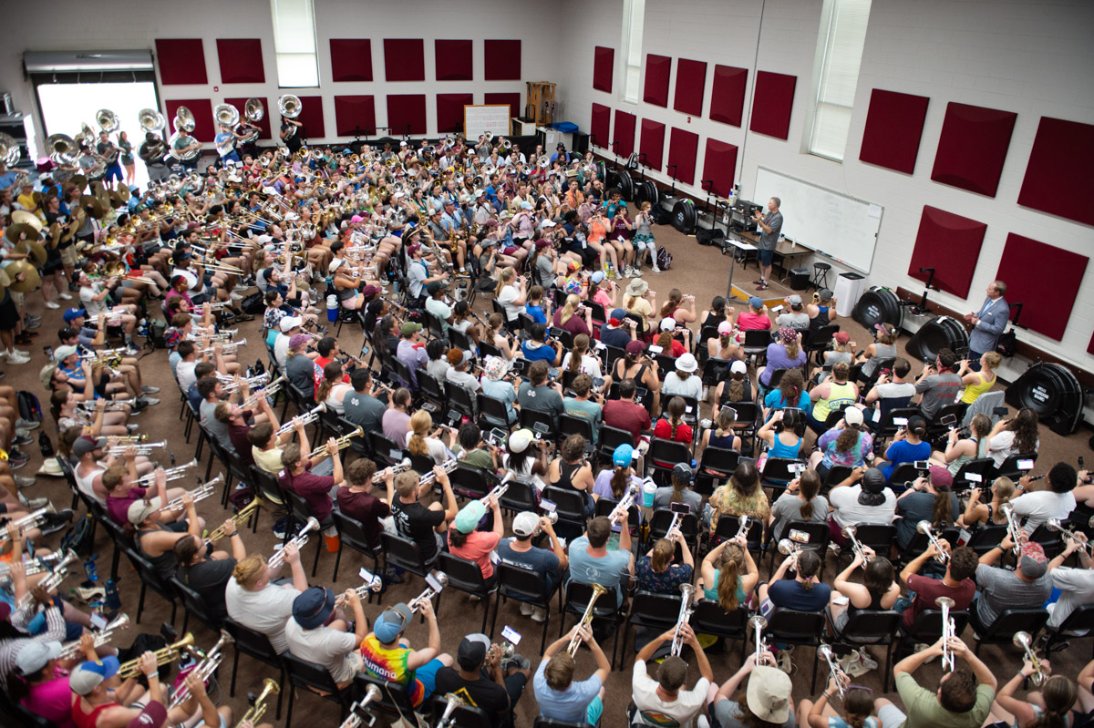 MSU Associate Director of Bands Clifton Taylor conducts a performance of "Hail State" during a visit by MSU President Mark E. Keenum, who looks on from the right. Each year, Keenum addresses the dedicated student members of the Famous Maroon Band who report to campus early to begin practice prior to the start of the fall semester.