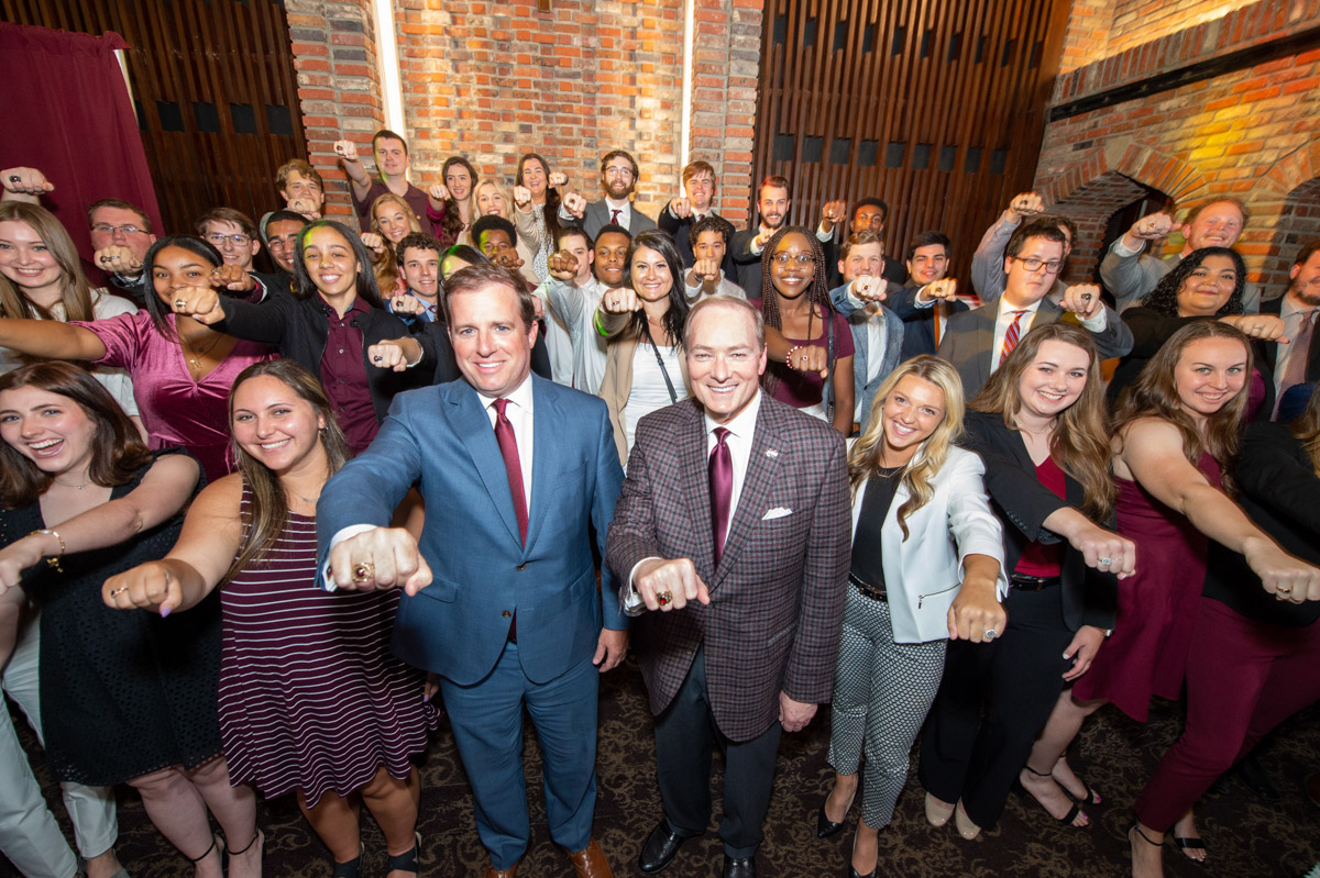 MSU President Mark E. Keenum (center right), state Sen. Josh Harkins, Class of 1997, and graduating seniors show off commemorative class rings during a May 3 ceremony at the Chapel of Memories. Keenum traditionally hands out class rings to students before each semester’s commencement ceremonies.