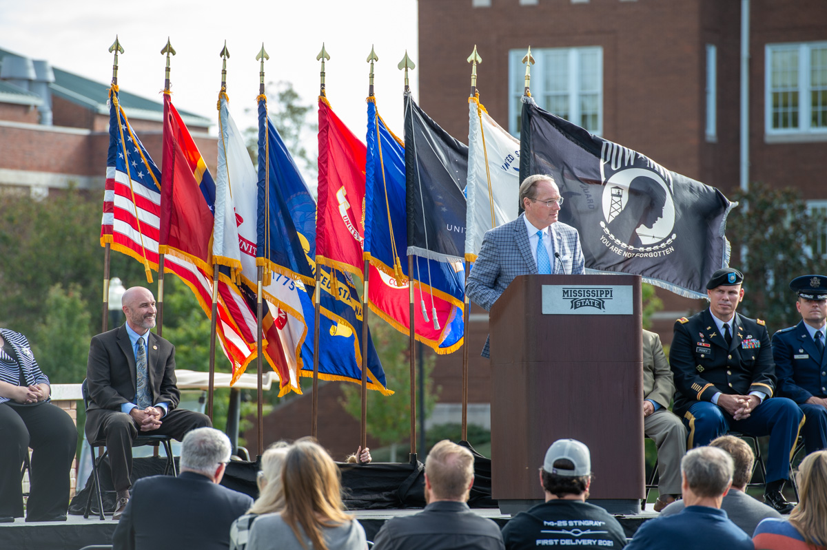 MSU President Mark E. Keenum speaks during the university’s annual Veterans Recognition Ceremony on the Drill Field. As a land-grant university with deep military roots, MSU continues to support 3,000 student veterans, service members and dependents through educational benefits, financial aid and academic policies.