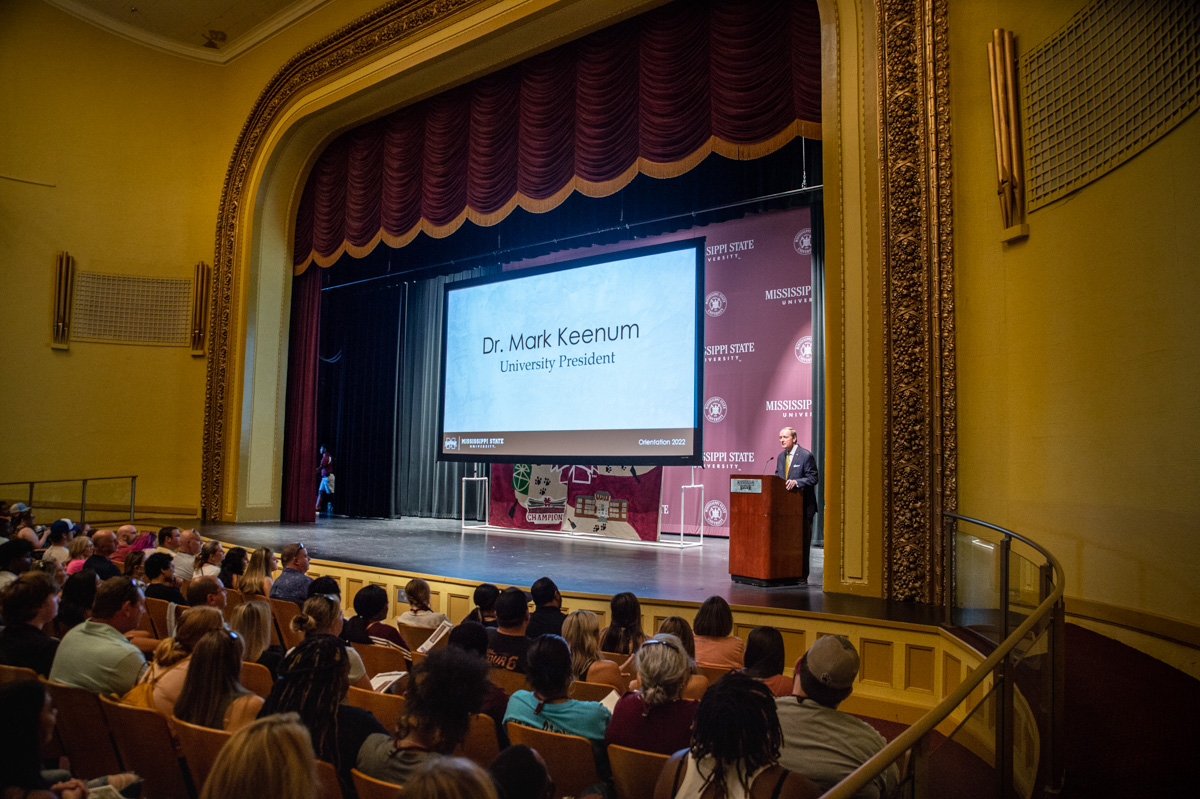 MSU President Mark E. Keenum greets new students and parents during an Orientation session this week. The top Bulldog personally shares tips for success with incoming MSU students. Among his recommendations are to “Ring Responsibly,” wear the Maroon and White with pride and get involved in campus activities. The president always urges students to make class attendance top priority throughout their college experience.